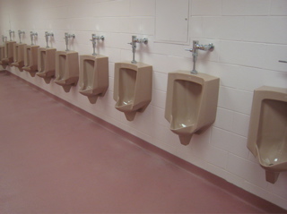 When I walk into the third bathroom, I’m in luck… sorta. There are 24 urinals along the wall and a single sit down commode at the end… in plain sight… with no stall around it. It’s just a random sit down commode in the middle of this room. There is no seat on this thing and hundreds of guys have been pissing all over it, all day. I grab a handful of paper towels and get in line for this lone commode.